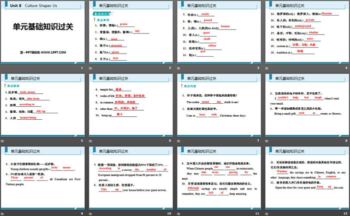 关键词:冀教版九年级下册英语PPT课件免费下载,单元基础知识过关PPT下载,Culture Shapes UsPPT下载,.PPT格式;