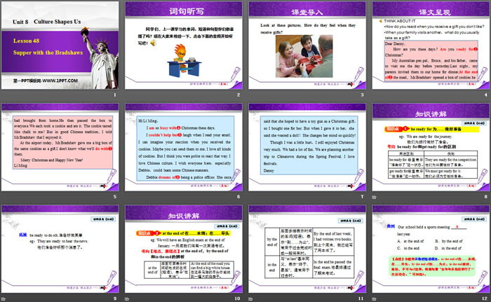 关键词:冀教版九年级下册英语PPT课件免费下载,Supper with the BradshawsPPT下载,Culture Shapes UsPPT下载,.PPT格式;