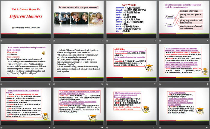 关键词:冀教版九年级下册英语PPT课件免费下载,Different MannersPPT下载,Culture Shapes UsPPT下载,.PPT格式;