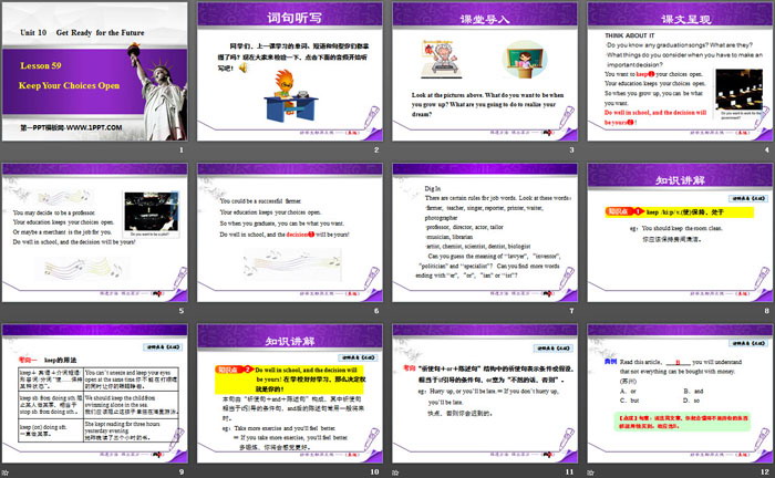 关键词:冀教版九年级下册英语PPT课件免费下载,Keep Your Choices OpenPPT下载,Get ready for the futurePPT下载,.PPT格式;
