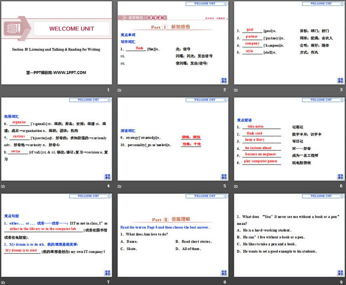关键词:人教版高中英语必修一PPT课件免费下载,Welcome UnitPPT下载,Listening and Talking&Reading for WritingPPT下载,.PPT格式;