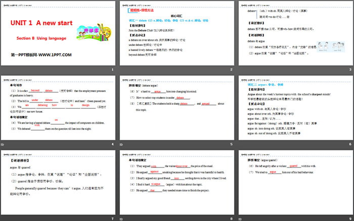 词汇一 debate(1)n. 辩论;讨论;争论 (2)vt. & vi. 辩论;讨论