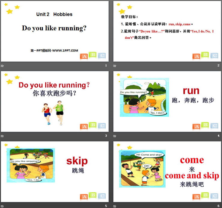 1. 能听懂、会说并认读单词:run, skip, come。