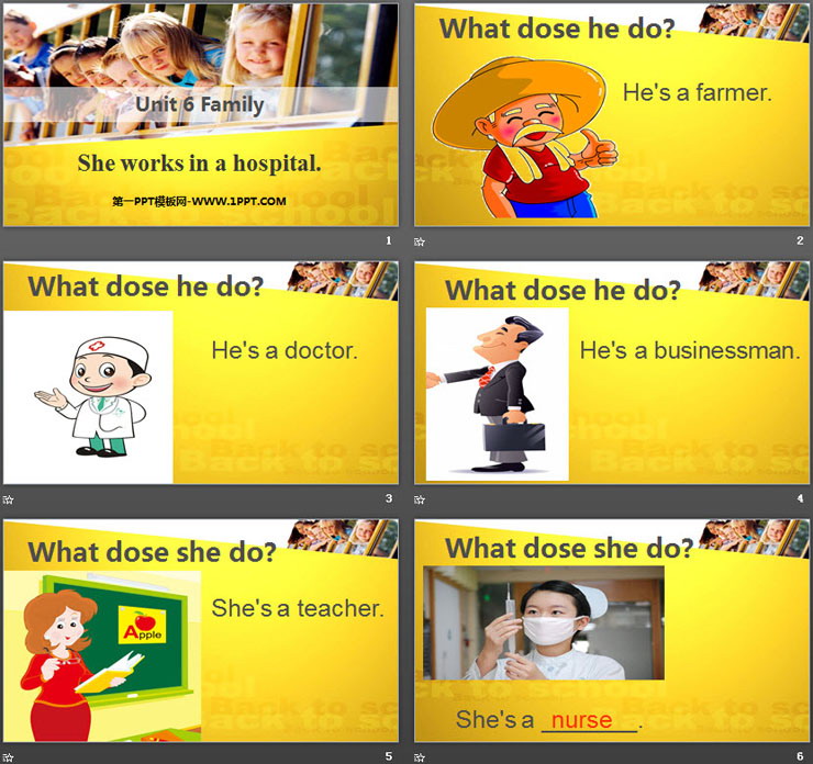 关键词:鲁科版英语四年级上册PPT课件免费下载,She works in a hospital PPT下载,Family PPT下载,.PPT格式;