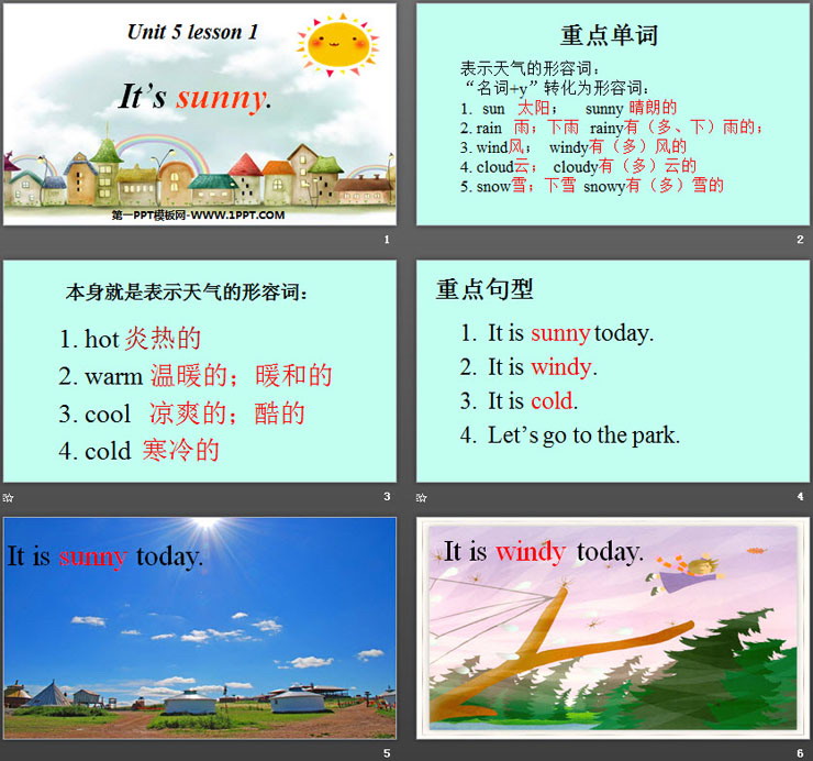 关键词:鲁科版英语四年级上册PPT课件免费下载,It's sunny PPT下载,Weather PPT下载,.PPT格式;