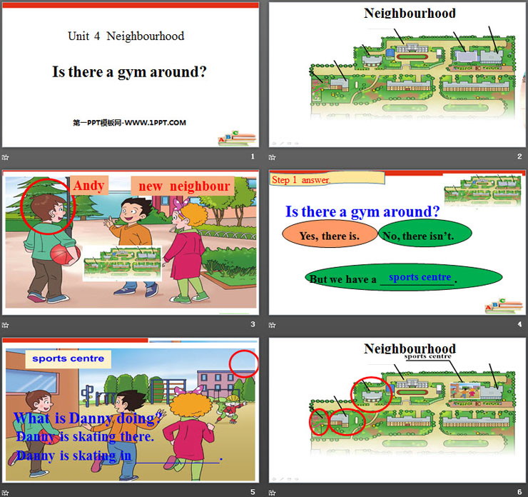 关键词:鲁科版英语五年级下册PPT课件免费下载,Is there a gym around? PPT下载,Neighbourhood PPT下载,.PPT格式;