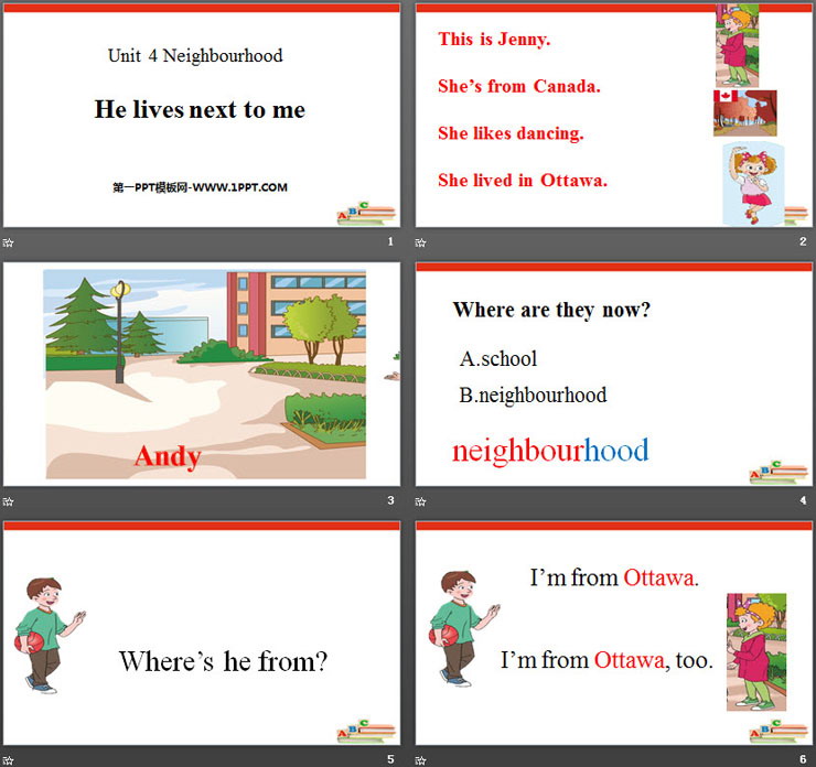 关键词:鲁科版英语五年级下册PPT课件免费下载,He lives next to me PPT下载,Neighbourhood PPT下载,.PPT格式;