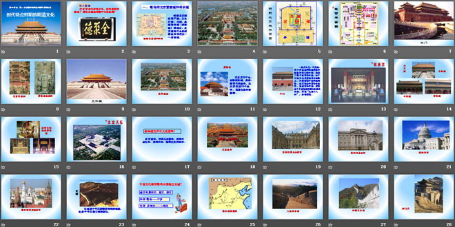 一条从午门、三大殿、后三宫直达御花园的钦安殿和神武门的中路,构成了整个故宫的中轴。这个中轴又在北京城的中轴线上。在紫禁城中轴宫殿两旁,还对称分布着许多殿宇,也都宏伟华丽。紫禁城4个城角都有精巧玲珑的角楼,所谓“九梁十八柱”,异常美观。