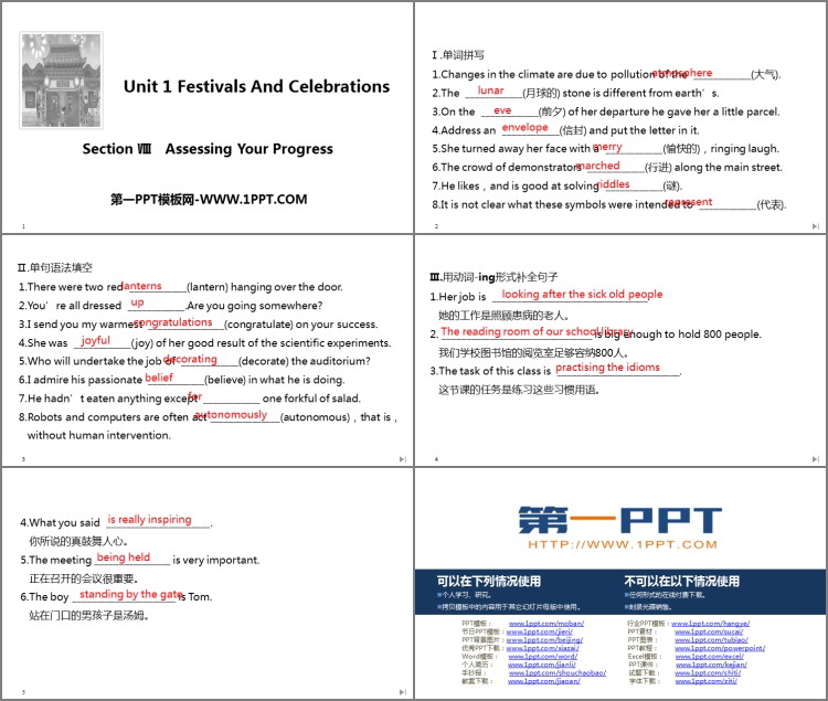《Festivals And Celebrations》Section Ⅷ PPT课件包含单词拼写、单句语法填空等内容。