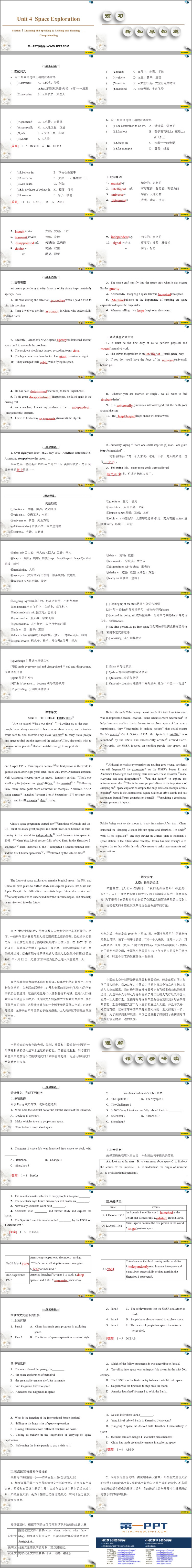 《Space Exploration》SectionⅠPPT课件包含词汇识记、尝试理解、表层理解、深度感悟等内容。