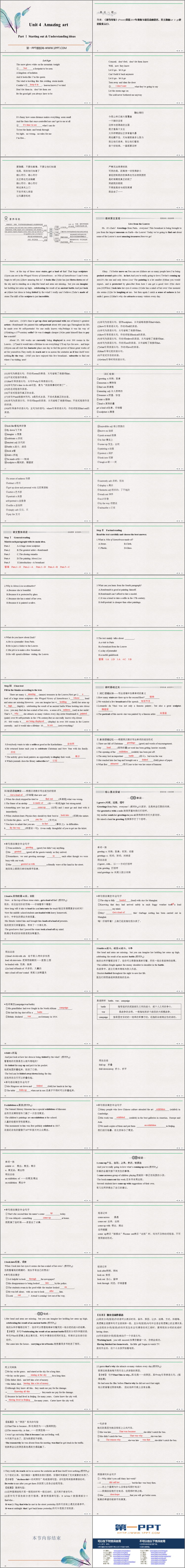 《Amazing art》PartⅠ PPT课件包括教材原文呈现、课文整体阅读、课时基础过关、核心要点突破等内容。