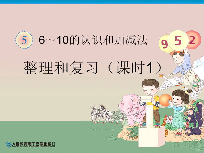 人教版一年级上册数学第五单元(6~10的认识和加减法)整理和复习一PPT课件下载;PPT课件内容:6~10的认识和加减法,整理和复习(课时1)一、复习数字:这一单元你学习了哪些数?请你写出来。按顺序在□里填数。上面一共有( )个图形。1. 小动物身上最大的数是( ) 最小的数是( )。2. 从右边数,第3只与第5只小动物身上的数的和是 ( )。3. 把左边的5只小动物身上的数,从大到小排列。 ( )>( )>( )>( )>( )二、布置作业作业:和爸爸、妈妈说说你今天的收获。关键词:人教版一年级数学上册PPT课件整理和复习认识数字数字的认识加减法幻灯片课件下载.PPT格式;