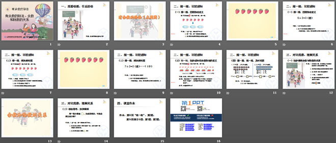 讲解:算式里的“1”表示剩下的1个草莓,在算式中称为“余数”,今天我们研究的是“有余数的除法”。