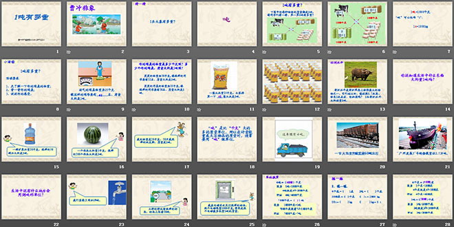 关键词:1吨有多重课件PPT,北师大版三年级下册数学PPT课件下载,三年级数学幻灯片课件下载,1吨有多重PPT课件下载,.PPT格式