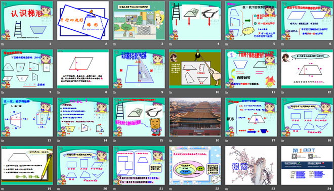 关键词:三角形平行四边形和梯形课件PPT,认识梯形课件PPT,苏教版四年级下册数学PPT课件下载,四年级数学幻灯片课件下载,三角形平行四边形和梯形PPT课件下载,认识梯形PPT课件下载,.PPT格式