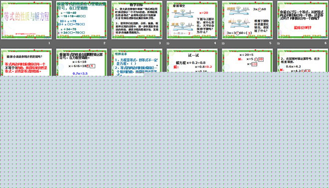 1、使大家在情境中理解“等式两边同时乘或除以一个不为0的数,所得结果仍然是等式”会用等式的这个性质解只含有乘法或除法运算的简单方程。