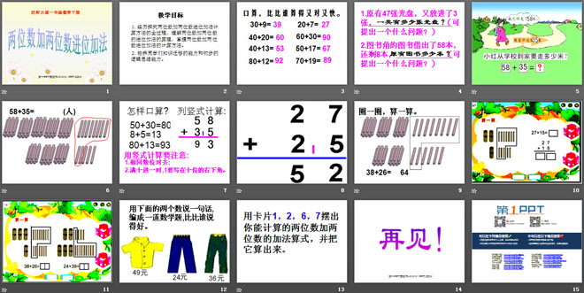 关键词:100以内的加法和减法课件PPT,两位数加两位数进位加法课件PPT,西师大版一年级下册数学PPT课件下载,一年级数学幻灯片课件下载,100以内的加法和减法PPT课件下载,两位数加两位数进位加法PPT课件下载,.PPT格式