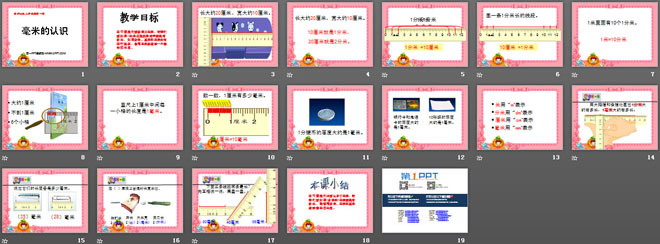 本节课我们要来学习毫米,同学们要知道1毫米在现实生活中到底有多长,知道分米、厘米和毫米如何进行换算,会用毫米来表示一个物体的长度。