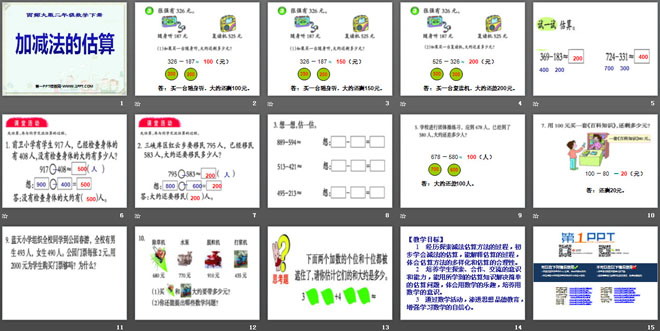 关键词:三位数的加减法课件PPT,加减法的估算课件PPT,西师大版二年级下册数学PPT课件下载,二年级数学幻灯片课件下载,三位数的加减法PPT课件下载,加减法的估算PPT课件下载,.PPT格式