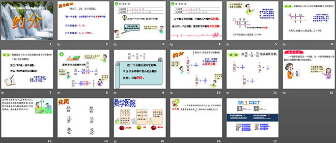 关键词:分数课件PPT,约分课件PPT,西师大版五年级下册数学PPT课件下载,五年级数学幻灯片课件下载,分数PPT课件下载,约分PPT课件下载,.PPT格式