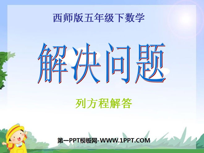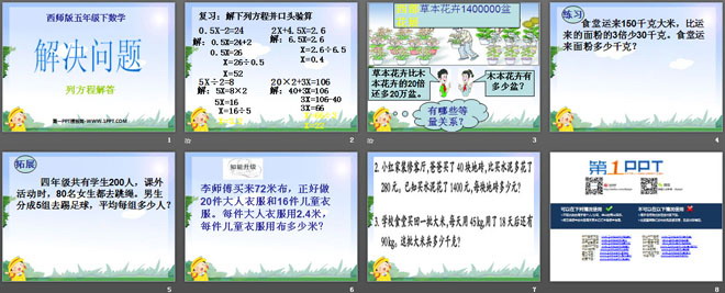 关键词:方程课件PPT,解决问题课件PPT,西师大版五年级下册数学PPT课件下载,五年级数学幻灯片课件下载,方程PPT课件下载,解决问题PPT课件下载,.PPT格式