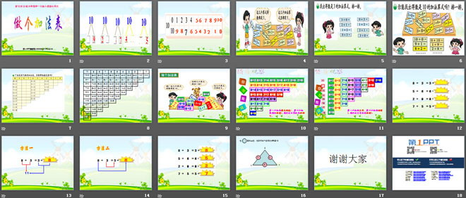 关键词:做个加法表课件,北师大版一年级上册数学PPT课件下载,一年级数学幻灯片课件下载,做个加法表PPT课件下载,.PPT格式;
