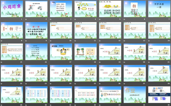 关键词:小鸡吃食课件,北师大版一年级上册数学PPT课件下载,一年级数学幻灯片课件下载,小鸡吃食PPT课件下载,.PPT格式;