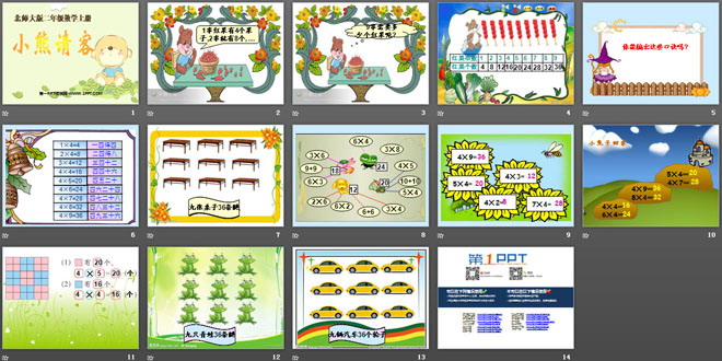 关键词:2~5的乘法口诀课件,小熊请客课件,北师大版二年级上册数学PPT课件下载,二年级数学幻灯片课件下载,2~5的乘法口诀PPT课件下载,小熊请客PPT课件下载,.PPT格式;