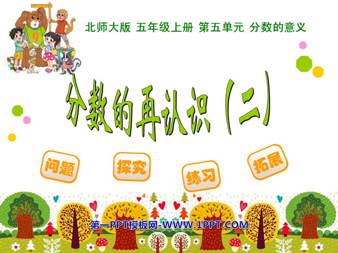 关键词:分数的意义课件,分数的再认识课件,北师大版五年级上册数学PPT课件下载,五年级数学幻灯片课件下载,分数的意义PPT课件下载,分数的再认识PPT课件下载,.PPT格式;