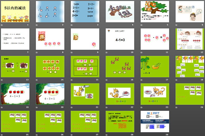 关键词:10以内的加法和减法课件,5以内的减法课件,苏教版一年级上册数学PPT课件下载,一年级数学幻灯片课件下载,10以内的加法和减法PPT课件下载,5以内的减法PPT课件下载,.PPT格式;