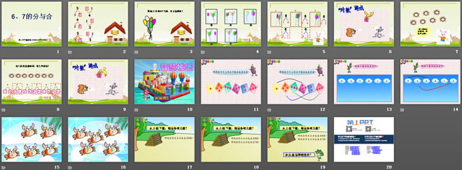 课件通过生动的动画和图片充分展示了6、7的分与合中的数学知识点,可以非常形象的帮助教学,是很好的小学一年级数学教学课件。