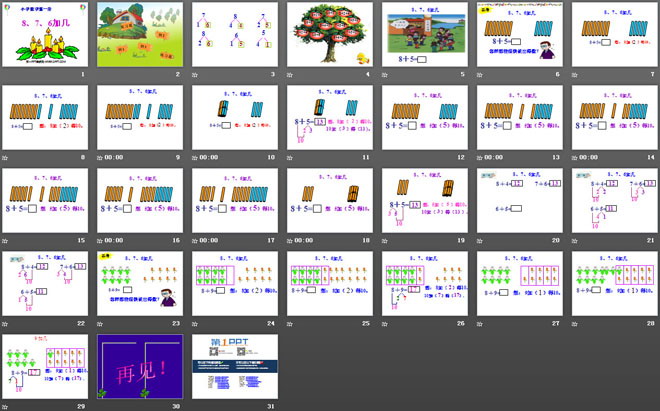 关键词:20以内的进位加法课件,876加几课件,苏教版一年级上册数学PPT课件下载,一年级数学幻灯片课件下载,20以内的进位加法PPT课件下载,876加几PPT课件下载,.PPT格式;