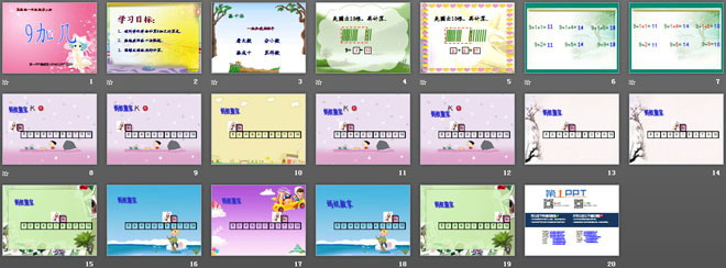 关键词:20以内的进位加法课件,9加几课件,苏教版一年级上册数学PPT课件下载,一年级数学幻灯片课件下载,20以内的进位加法PPT课件下载,9加几PPT课件下载,.PPT格式;