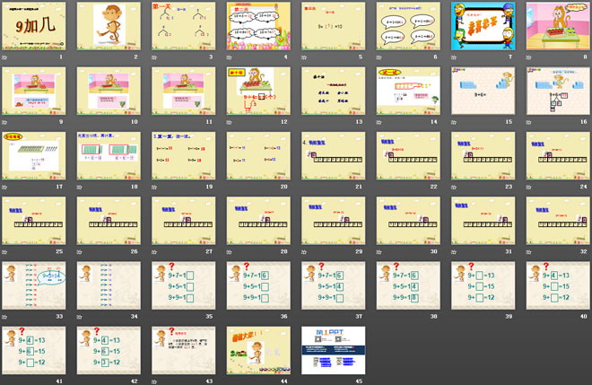 关键词:20以内的进位加法课件,9加几课件,苏教版一年级上册数学PPT课件下载,一年级数学幻灯片课件下载,20以内的进位加法PPT课件下载,9加几PPT课件下载,.PPT格式;