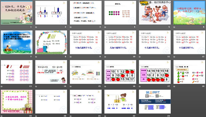 关键词:认识11-20各数课件,10加几、十几加几和相应的减法课件,苏教版一年级上册数学PPT课件下载,一年级数学幻灯片课件下载,认识11-20各数PPT课件下载,10加几、十几加几和相应的减法PPT课件下载,.PPT格式;