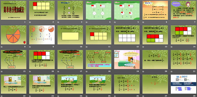 关键词:分数的初步认识课件,简单的分数加减法课件,苏教版三年级上册数学PPT课件下载,三年级数学幻灯片课件下载,分数的初步认识PPT课件下载,简单的分数加减法PPT课件下载,.PPT格式;