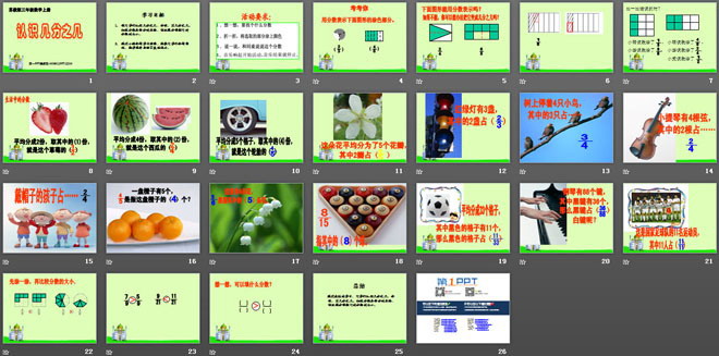 关键词:分数的初步认识课件,认识几分之几课件,苏教版三年级上册数学PPT课件下载,三年级数学幻灯片课件下载,分数的初步认识PPT课件下载,认识几分之几PPT课件下载,.PPT格式;