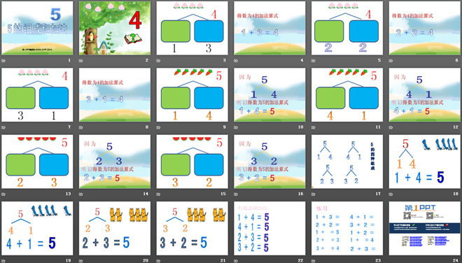 关键词:10以内数的认识和加减法课件,5的组成和加法课件,西师大版一年级上册数学PPT课件下载,一年级数学幻灯片课件下载,10以内数的认识和加减法PPT课件下载,5的组成和加法PPT课件下载,.PPT格式;