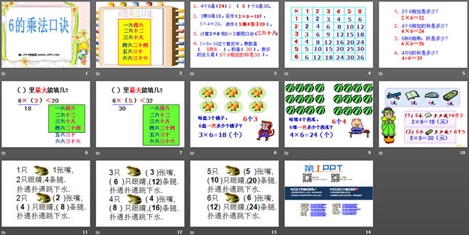 关键词:表内乘法课件,6的乘法口诀课件,西师大版二年级上册数学PPT课件下载,二年级数学幻灯片课件下载,表内乘法PPT课件下载,6的乘法口诀PPT课件下载,.PPT格式;