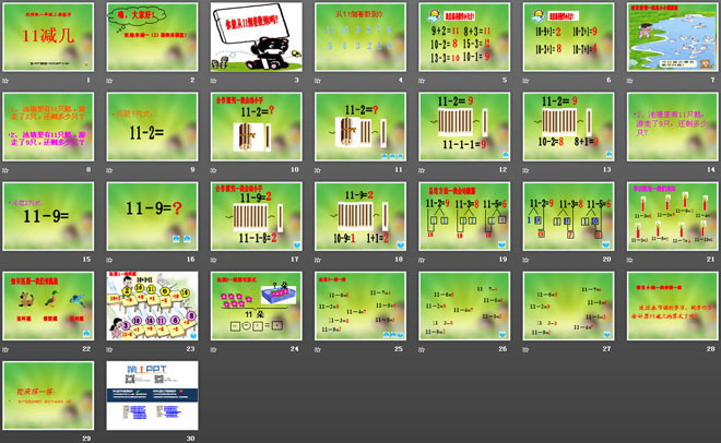 关键词:20以内的退位减法课件,11减几课件,西师大版一年级上册数学PPT课件下载,一年级数学幻灯片课件下载,20以内的退位减法PPT课件下载,11减几PPT课件下载,.PPT格式;