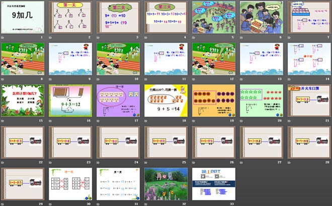 关键词:20以内的进位加法课件,9加几课件,西师大版一年级上册数学PPT课件下载,一年级数学幻灯片课件下载,20以内的进位加法PPT课件下载,9加几PPT课件下载,.PPT格式;