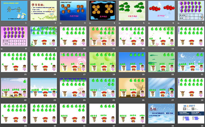 课件通过品均分水果的方式将表内除法的平均分知识点充分展示出来,是非常实用的小学数学课件。