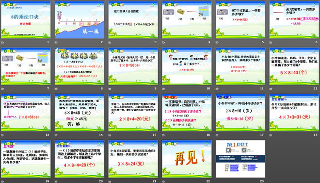 关键词:表内乘法课件,8的乘法口诀课件,西师大版二年级上册数学PPT课件下载,二年级数学幻灯片课件下载,表内乘法PPT课件下载,8的乘法口诀PPT课件下载,.PPT格式;
