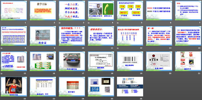 本节课我们主要来学习数字与编码,同学们结合日常生活实际理解并掌握编码的含义,知道一些常用的编码中的数字所代表的含义,能够根据编码的规则自己设计一些有用的码。
