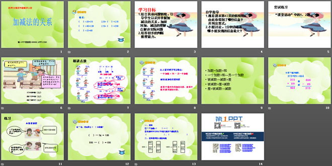 关键词:加减法的关系和加法运算律课件,加减法的关系课件,西师大版四年级上册数学PPT课件下载,四年级数学幻灯片课件下载,加减法的关系和加法运算律PPT课件下载,加减法的关系PPT课件下载,.PPT格式;