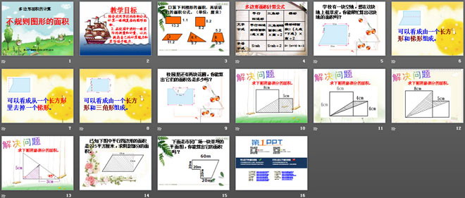 关键词:多边形面积的计算课件,不规则图形的面积课件,西师大版五年级上册数学PPT课件下载,五年级数学幻灯片课件下载,多边形面积的计算PPT课件下载,不规则图形的面积PPT课件下载,.PPT格式;