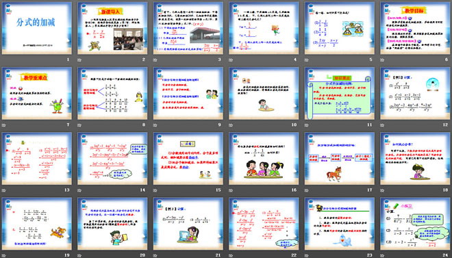 关键词:分式课件,分式的加减课件,新人教版八年级上册数学PPT课件,八年级数学幻灯片课件下载,分式PPT课件下载,分式的加减PPT课件下载,.ppt格式