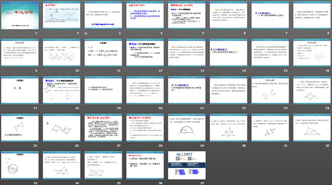 1. 把一个图形绕着某一点旋转180°,如果它能和另一个图形重合,那么我们就说这两个图形成中心对称,这个点叫做对称中心,这两个图形中的对应点,叫做关于中心的对称点.