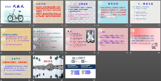 关键词:整式及其加减课件,代数式课件,北师大版七年级上册数学PPT课件,七年级数学幻灯片课件下载,整式及其加减PPT课件下载,代数式PPT课件下载,.ppt格式