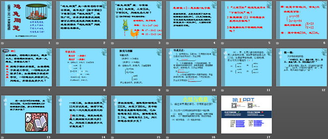 关键词:二元一次方程组课件,应用二元一次方程组鸡兔同笼课件,北师大版八年级上册数学PPT课件,八年级数学幻灯片课件下载,二元一次方程组PPT课件下载,应用二元一次方程组鸡兔同笼PPT课件下载,.ppt格式